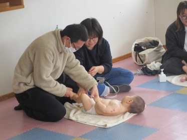 最近はお父さんも一緒に参加して下さることもあります。お姉ちゃんをお父さんがマッサージして、赤ちゃんをお母さんがマッサージしたり、お父さんが赤ちゃんのマッサージを初体験するのをお母さんが嬉しそうに見つめていたり…。嬉しい時間が流れていました。 - マッサージ初体験をしたお父さんは、「いつもこんな風に赤ちゃんとお母さんが過ごしているんだなあというのを知ることが出来て、とっても嬉しかったです」と言って頂きました。お母さんが赤ちゃんに毎日、たっぷりと愛情を注いでくれていることをお父さんに知って頂ける貴重な機会になりました。